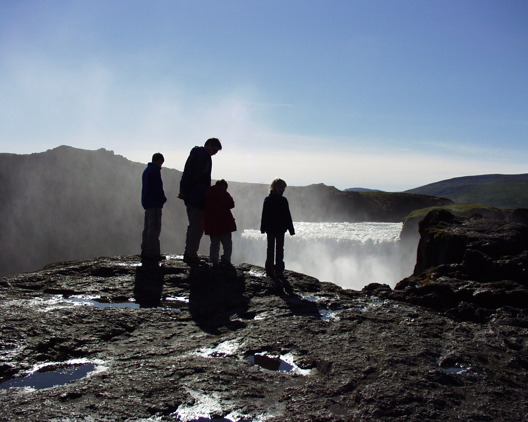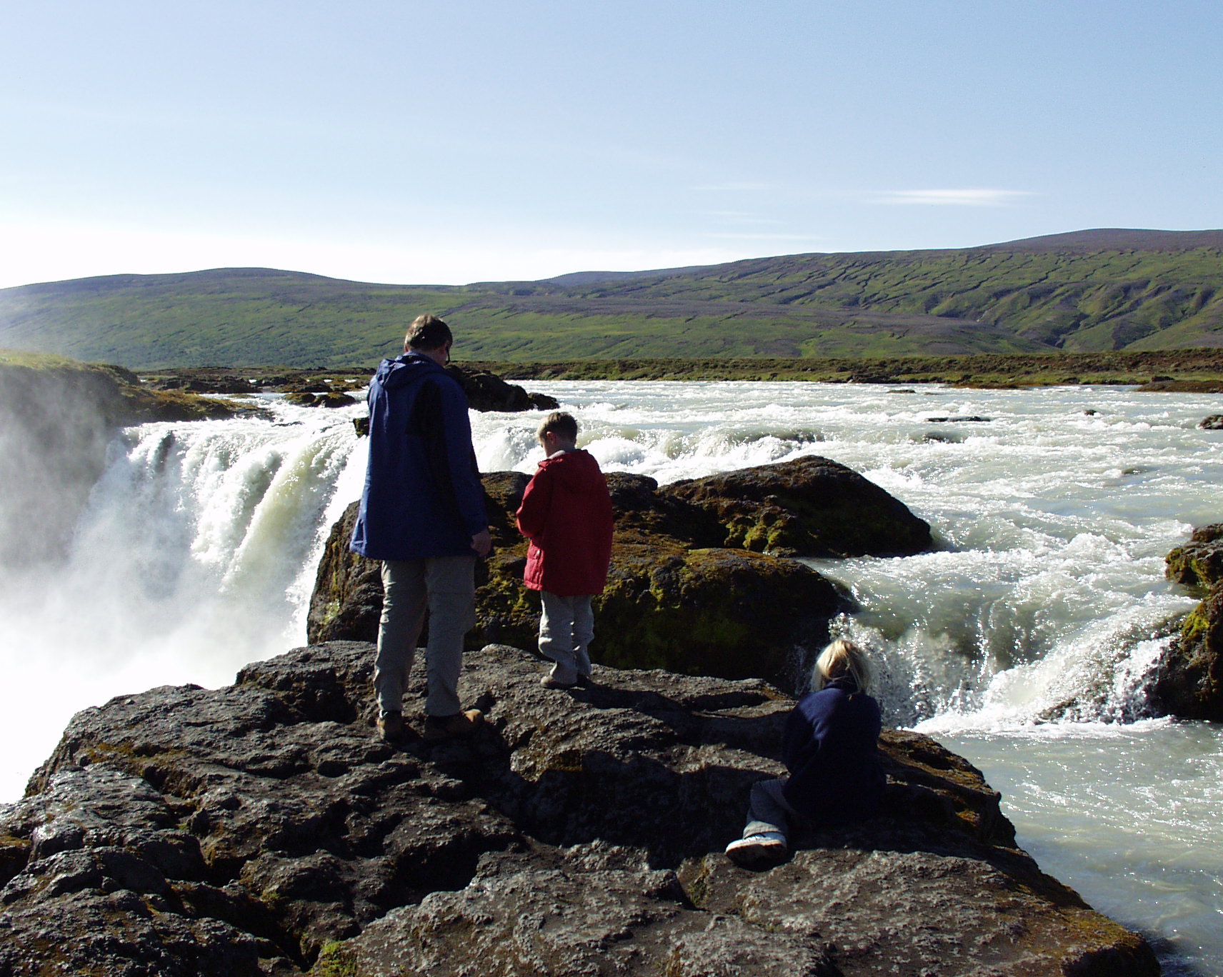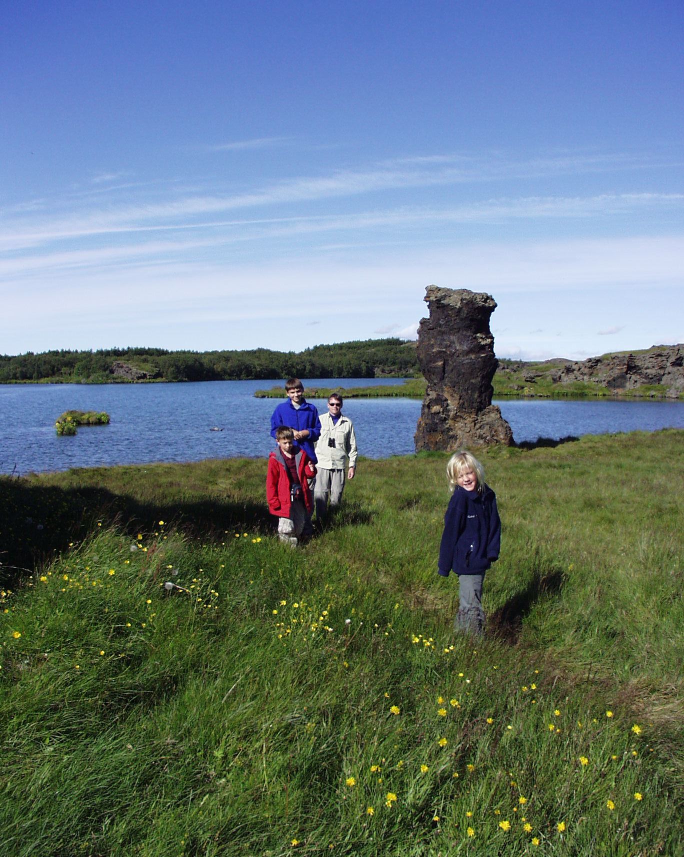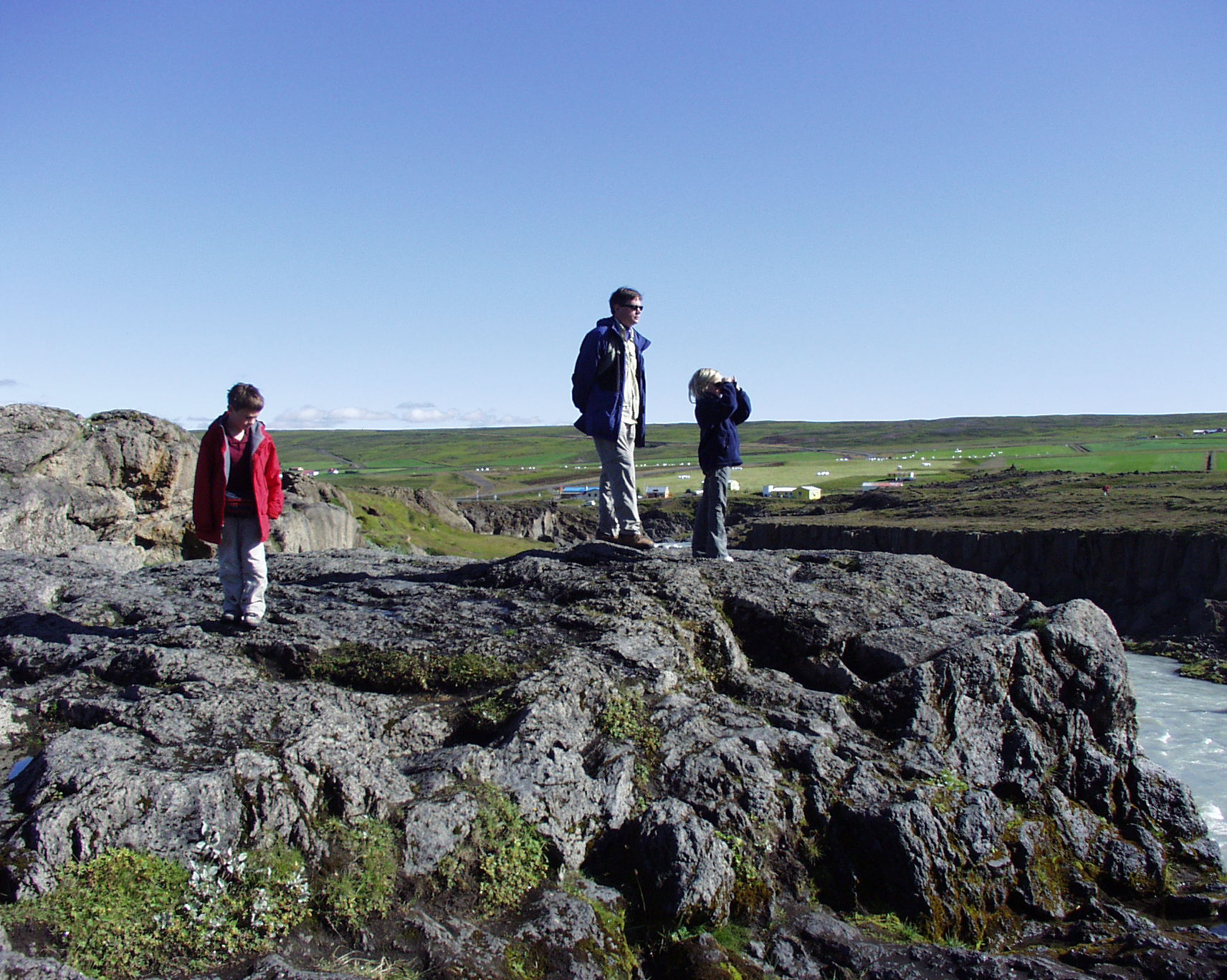 Monday was a glorious morning, and the formerly grumpy guest house owner was somehow transformed into a humming, toe-tapping, and happy man by the American gospel music belting out of the radio in his dining room during breakfast. He had either decided that he would be appropriately paid for the 5-ness of our family, or that it didn't matter so much that it would spoil the morning. He cheerfully showed me how to call Reykjavik from our room to upload our web page. I later realized that he might have been so happy because of what he was able to charge for national phone calls. We spent most of the day on an excursion slightly inland to see the huge lake Mývatn. It is fairly shallow and crystal clear, and it is named after a type of fly (Midge Fly, in English) that breeds in the lake and surrounding rivers. On the way to the lake, we stopped to see the Gödafoss waterfall, so named because of the actions of the leader of the Icelandic governing assembly in something like the early 11th century. He stopped here to toss his various idols and statues of the Norse gods over the edge of the falls after presiding at a meeting during which it was decided that the country should adopt Christianity. The falls are thundering, powerful, and drop a good 15-20 meters. We all speculated as to whether the statues and idols had ever been fished out or whether they were still down there. Maybe Geraldo should check it out.