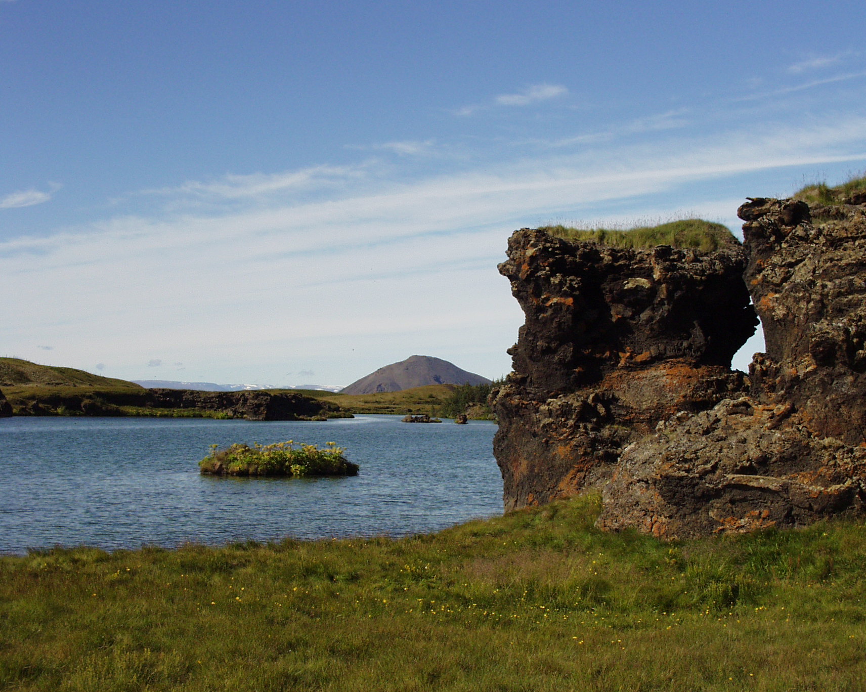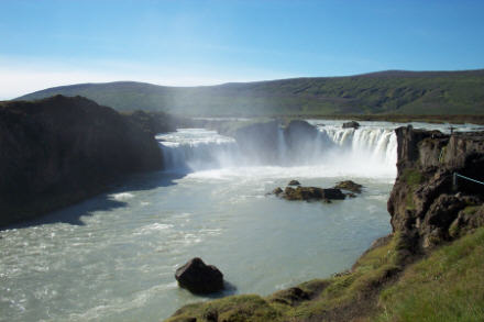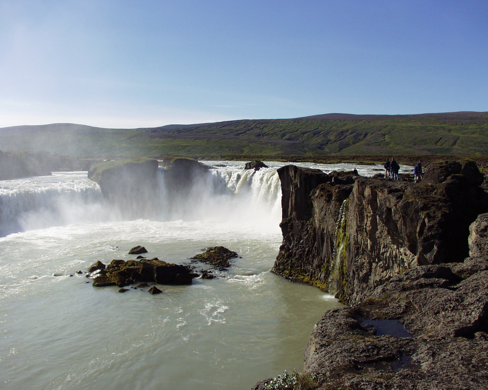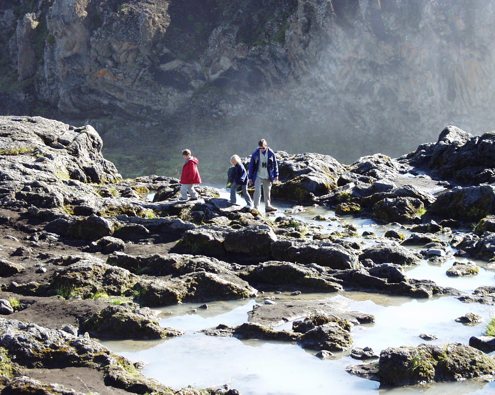 Monday was a glorious morning, and the formerly grumpy guest house owner was somehow transformed into a humming, toe-tapping, and happy man by the American gospel music belting out of the radio in his dining room during breakfast. He had either decided that he would be appropriately paid for the 5-ness of our family, or that it didn't matter so much that it would spoil the morning. He cheerfully showed me how to call Reykjavik from our room to upload our web page. I later realized that he might have been so happy because of what he was able to charge for national phone calls. We spent most of the day on an excursion slightly inland to see the huge lake Mývatn. It is fairly shallow and crystal clear, and it is named after a type of fly (Midge Fly, in English) that breeds in the lake and surrounding rivers. On the way to the lake, we stopped to see the Gödafoss waterfall, so named because of the actions of the leader of the Icelandic governing assembly in something like the early 11th century. He stopped here to toss his various idols and statues of the Norse gods over the edge of the falls after presiding at a meeting during which it was decided that the country should adopt Christianity. The falls are thundering, powerful, and drop a good 15-20 meters. We all speculated as to whether the statues and idols had ever been fished out or whether they were still down there. Maybe Geraldo should check it out.