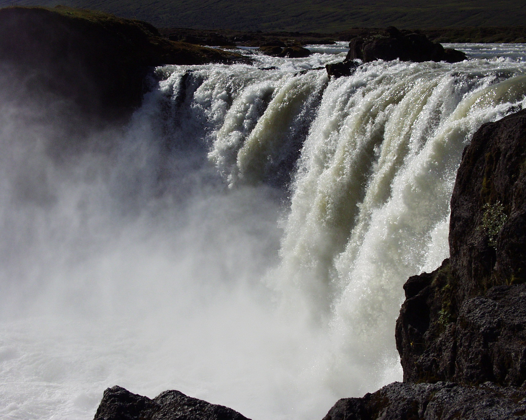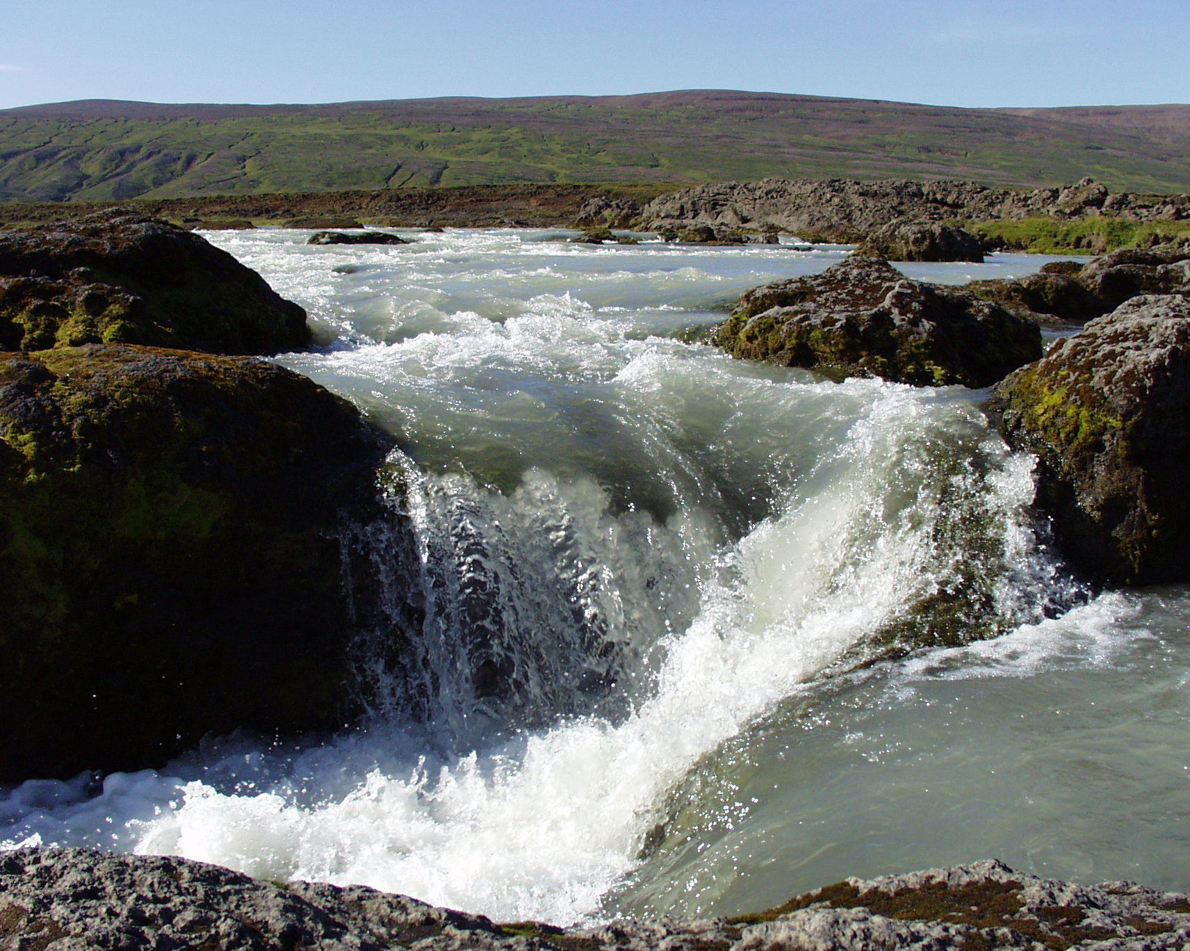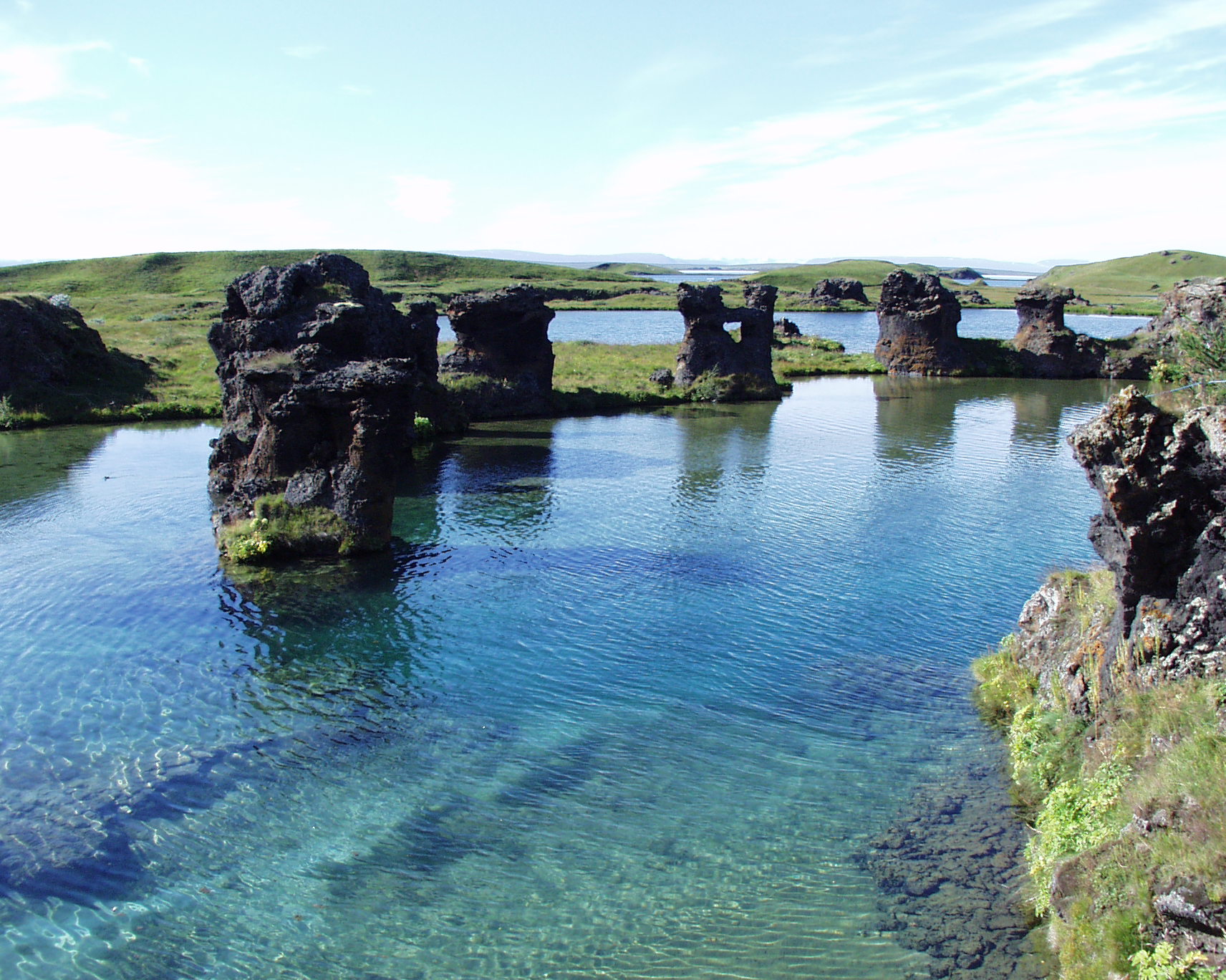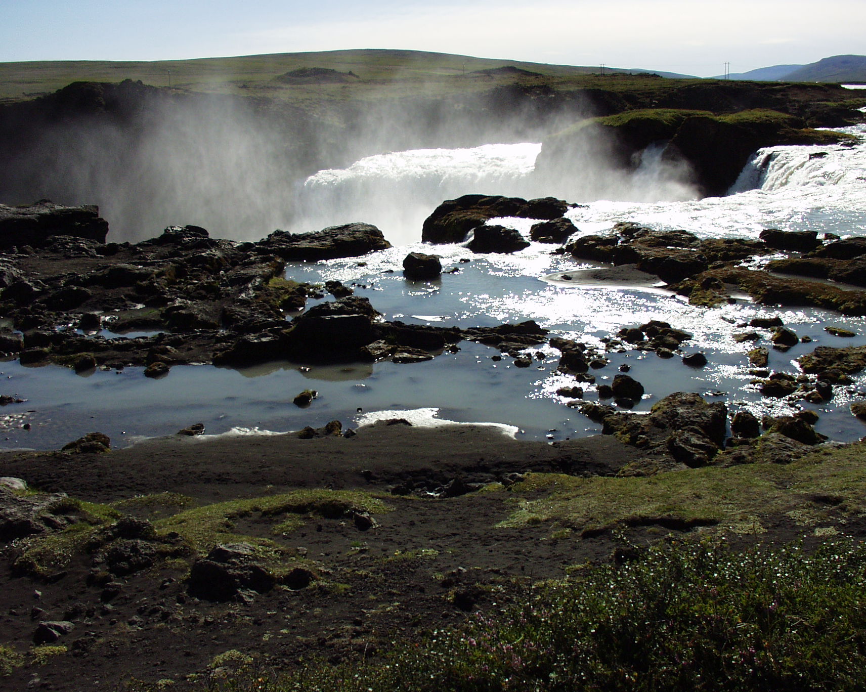 Monday was a glorious morning, and the formerly grumpy guest house owner was somehow transformed into a humming, toe-tapping, and happy man by the American gospel music belting out of the radio in his dining room during breakfast. He had either decided that he would be appropriately paid for the 5-ness of our family, or that it didn't matter so much that it would spoil the morning. He cheerfully showed me how to call Reykjavik from our room to upload our web page. I later realized that he might have been so happy because of what he was able to charge for national phone calls. We spent most of the day on an excursion slightly inland to see the huge lake Mývatn. It is fairly shallow and crystal clear, and it is named after a type of fly (Midge Fly, in English) that breeds in the lake and surrounding rivers. On the way to the lake, we stopped to see the Gödafoss waterfall, so named because of the actions of the leader of the Icelandic governing assembly in something like the early 11th century. He stopped here to toss his various idols and statues of the Norse gods over the edge of the falls after presiding at a meeting during which it was decided that the country should adopt Christianity. The falls are thundering, powerful, and drop a good 15-20 meters. We all speculated as to whether the statues and idols had ever been fished out or whether they were still down there. Maybe Geraldo should check it out.