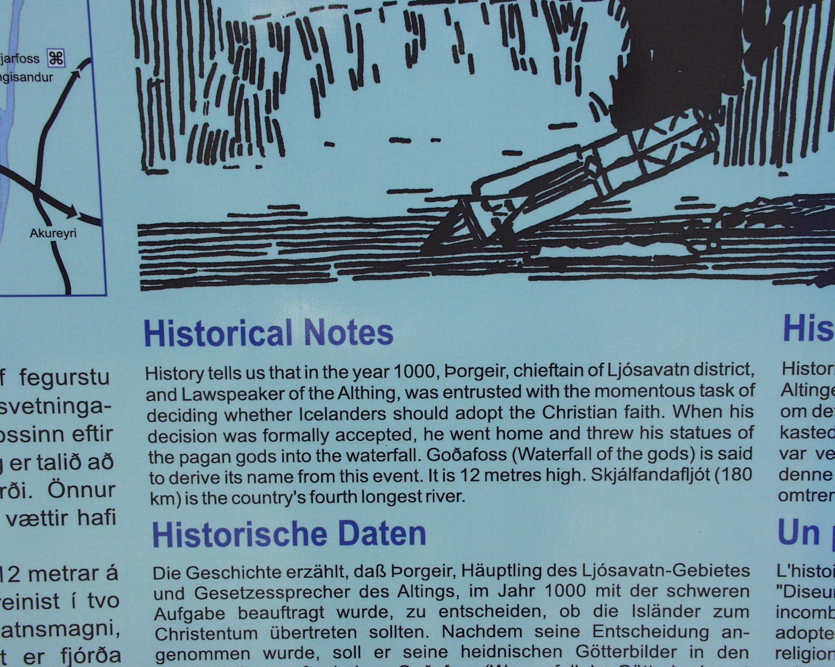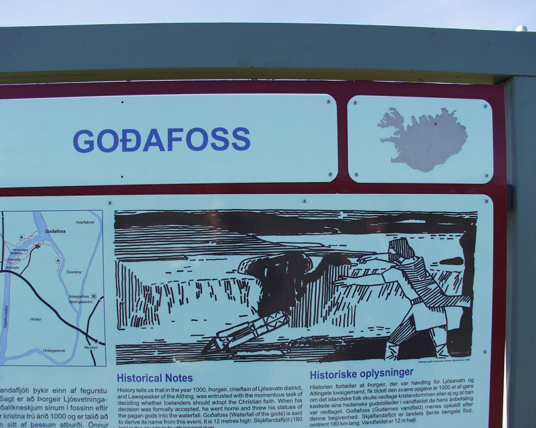 Lake Mývatn A helpful signpost explains the historical significance of Gödafoss,