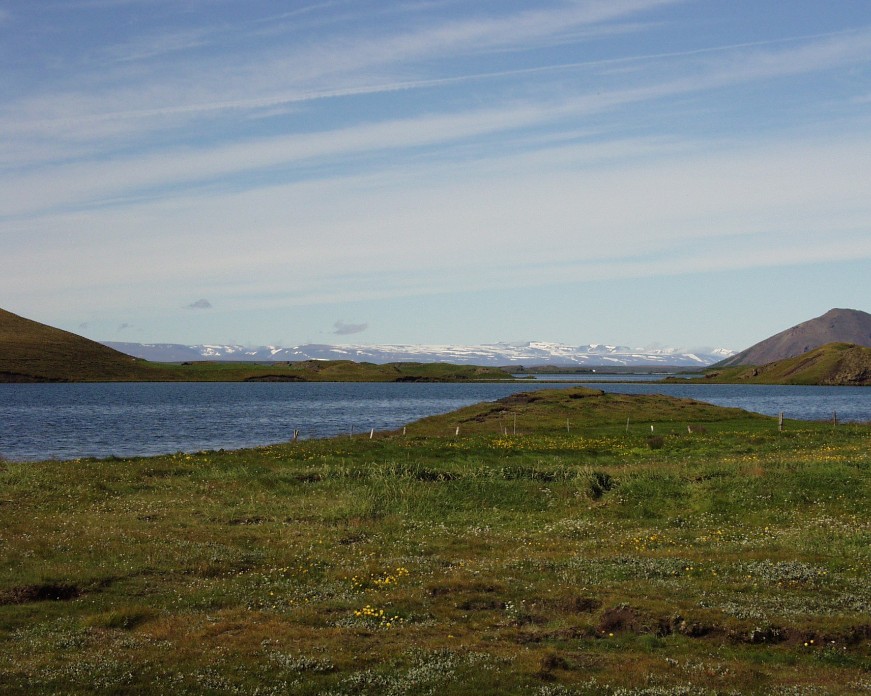 When we arrived at the lake and got out of the car to stop for lunch, we were relieved to find out that the clouds of flies were not interested in biting or landing on humans, although they occasionally can't help flying up your nose, because after all, you are in the way. The lake is quite large albeit shallow, and there are many interesting and diverse natural phenomena (a.k.a. "things") around the perimeter. The bottom of the lake is coated with a layer of diatoms, and there is a large factory at the north end of the lake which extracts silicate products from the diatoms. I think that there is a little bit of controversy about how environmentally disruptive the diatom removal is and to what extent it should be regulated, but invoking the privilege of the transient visitor, I filed this issue under the convenient "not anything for me to do about it" category. In general the island of Iceland is a beautiful and unspoiled natural treasure. The people and their government seem well aware of the value and importance of this heritage, both for themselves and the rest of the entire world. Facilitating our full appreciation of this natural splendor, the glorious morning evolved into a perfect day, and we took several short hikes at different spots around the lake. The flies drive a thriving food chain and we saw many people fly fishing (many in Iceland is more than 3) and one of our guidebooks says that more varieties of ducks nest here than anywhere else. I'm not sure if the else means Iceland, Europe, or the entire planet Earth. We saw some fairly familiar waterfowl including swans, as well as some interesting shorebirds that I didn't recognize. I tried looking some up later, clumsily attempting to figure out how to use a bird book at the Guesthouse. Birding will not be my next hobby.